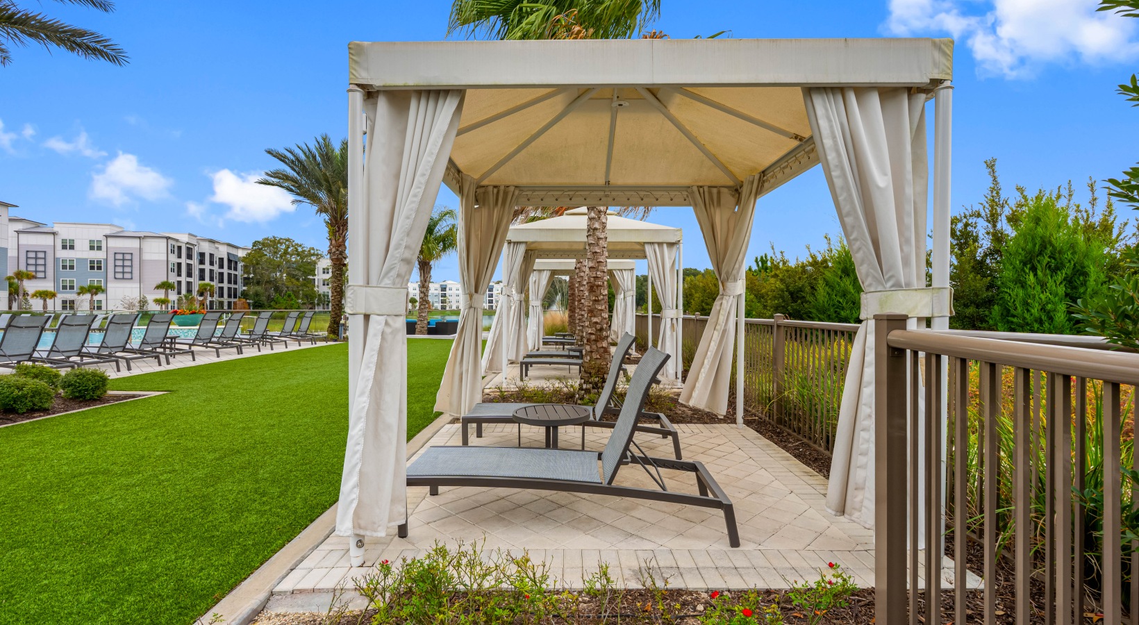 • Private poolside cabanas with lounge seating at Bainbridge Avenues Walk apartments, featuring a resort-style pool, palm trees, and landscaped outdoor spaces.