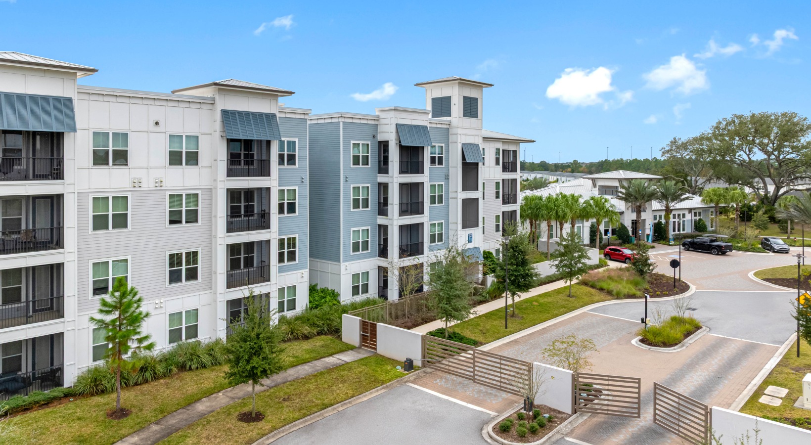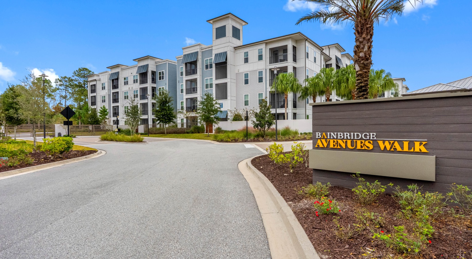 • Contemporary apartment residences with palm-lined streets and controlled access entry at Bainbridge Avenues Walk.