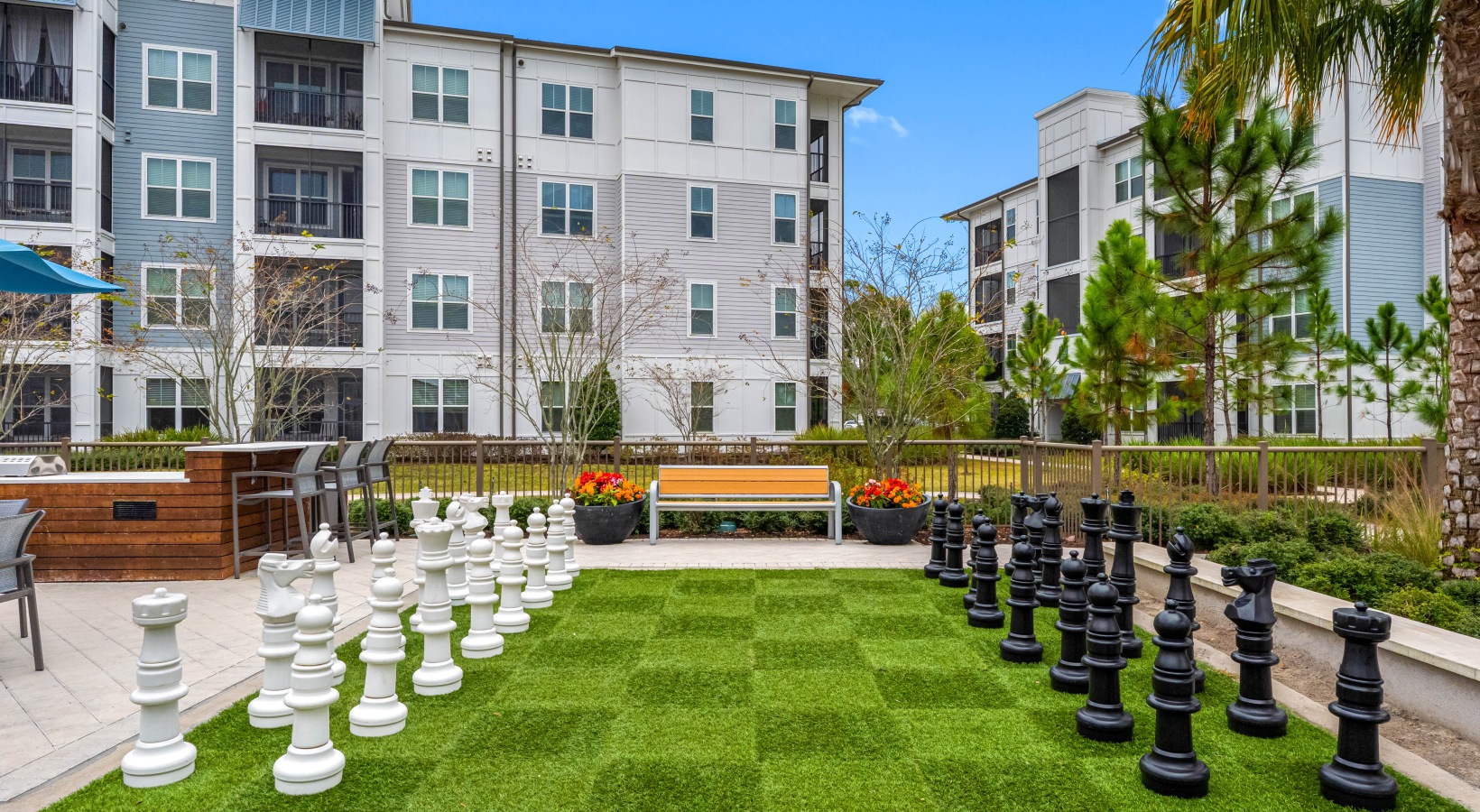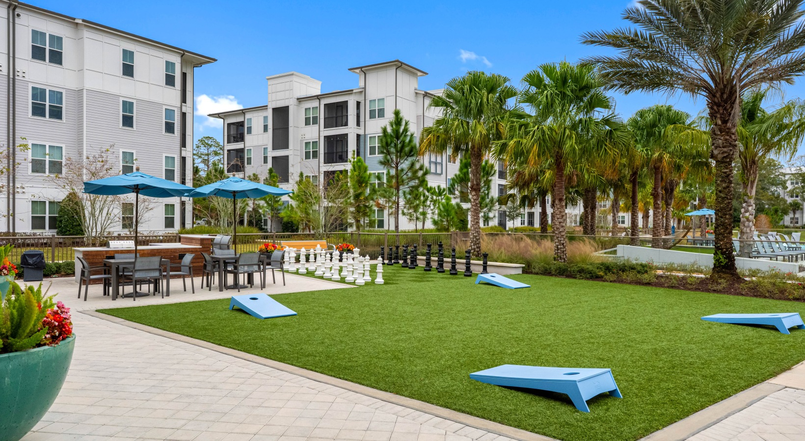 • Outdoor recreation lawn with cornhole boards, oversized chess set, and seating at Bainbridge Avenues Walk apartments.