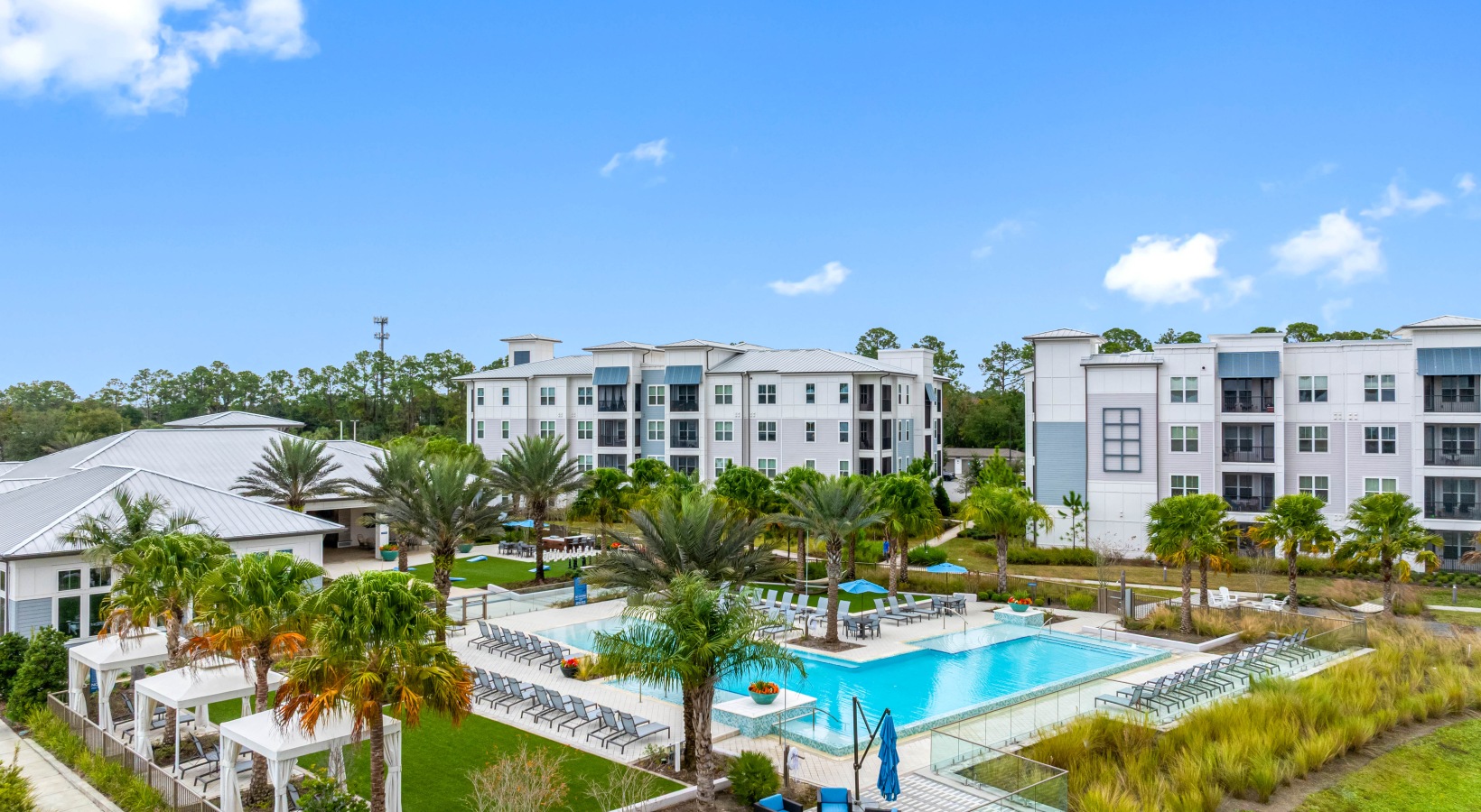 • Aerial view of Bainbridge Avenues Walk apartments showcasing a resort-style pool, private cabanas, palm-lined courtyards, and modern apartment buildings.